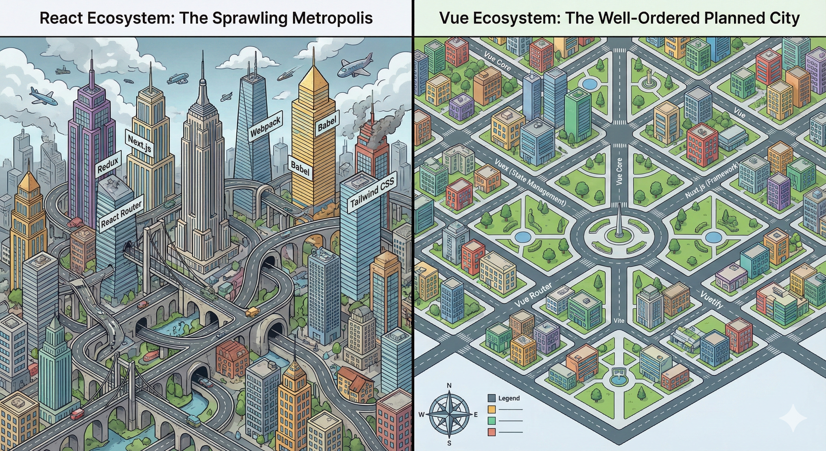 기술의 우수성만큼이나 중요한 것이 문제 해결을 위한 생태계와 커뮤니티의 규모입니다. 이 부분에서는 React가 압도적인 우위를 점하고 있습니다. React는 메타(Meta)의 전폭적인 지원과 방대한 사용자층을 바탕으로, 거의 모든 문제에 대한 솔루션이 이미 존재합니다. UI 라이브러리, 상태 관리 도구, 테스트 유틸리티 등 선택의 폭이 매우 넓으며, Next.js와 같은 메타 프레임워크는 엔터프라이즈급 웹 애플리케이션의 표준으로 자리 잡았습니다. Stack Overflow나 GitHub에서의 활동량 또한 React가 월등히 높습니다.